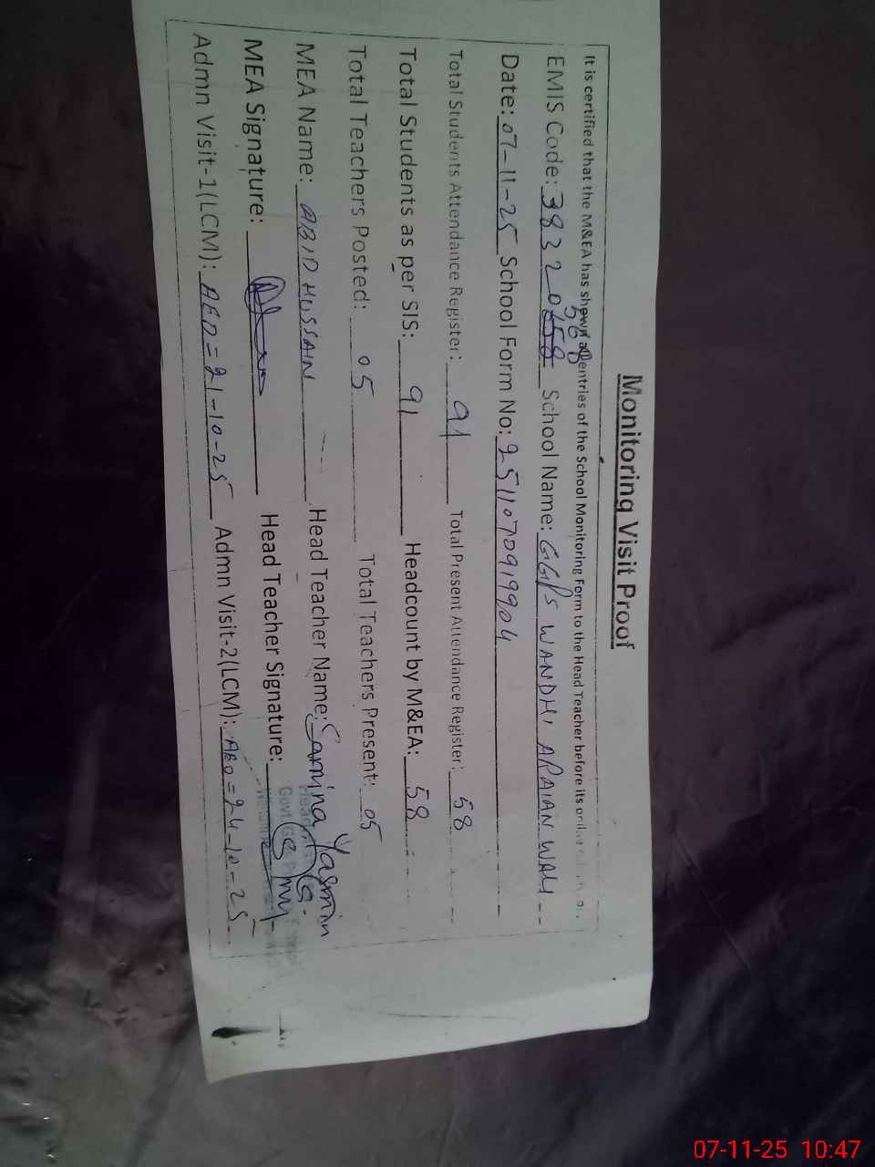 | Attendance Register | Head Teacher | MEA with School | Visit Proof |