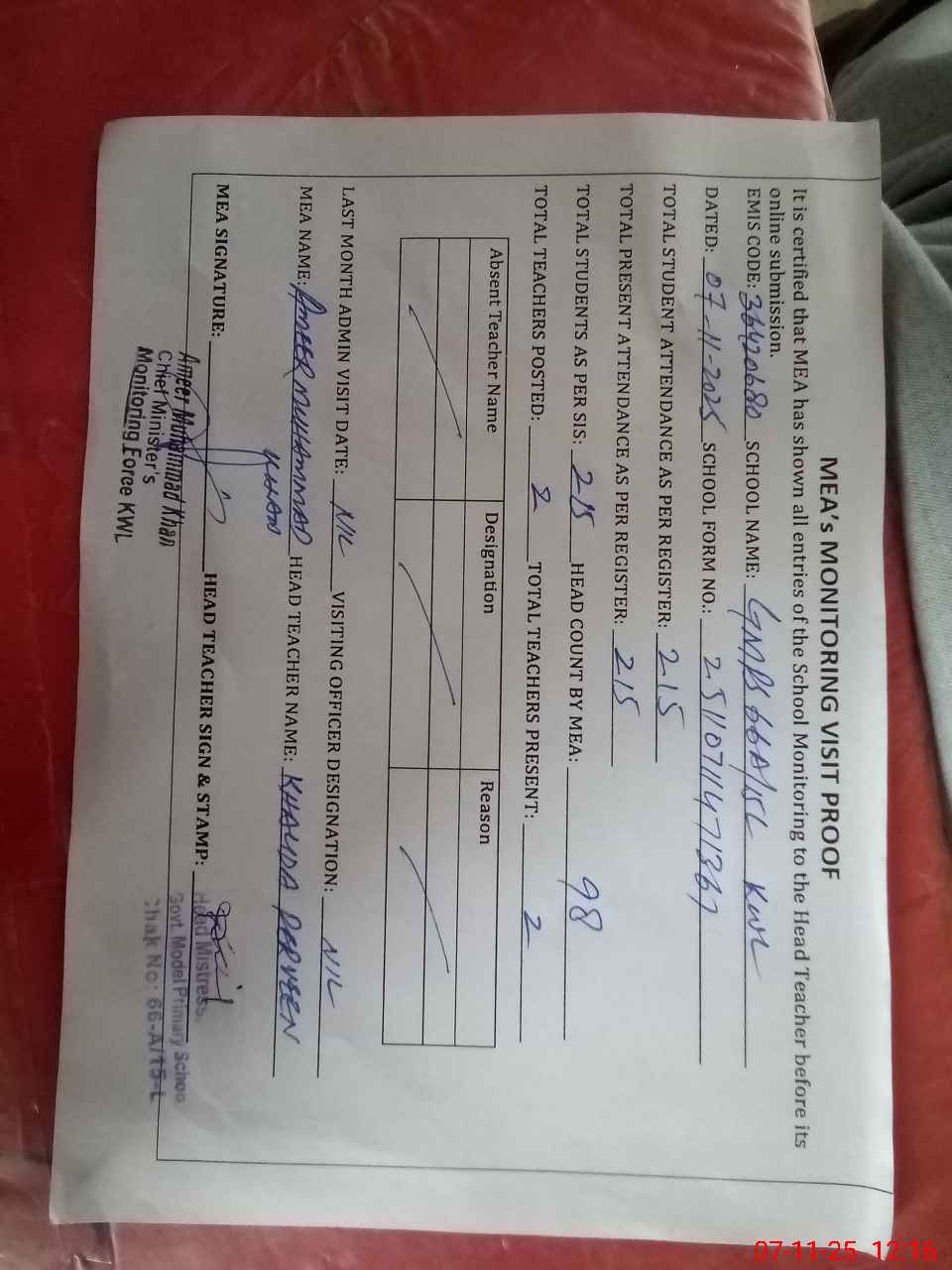 | Attendance Register | Head Teacher | MEA with School | Visit Proof |
