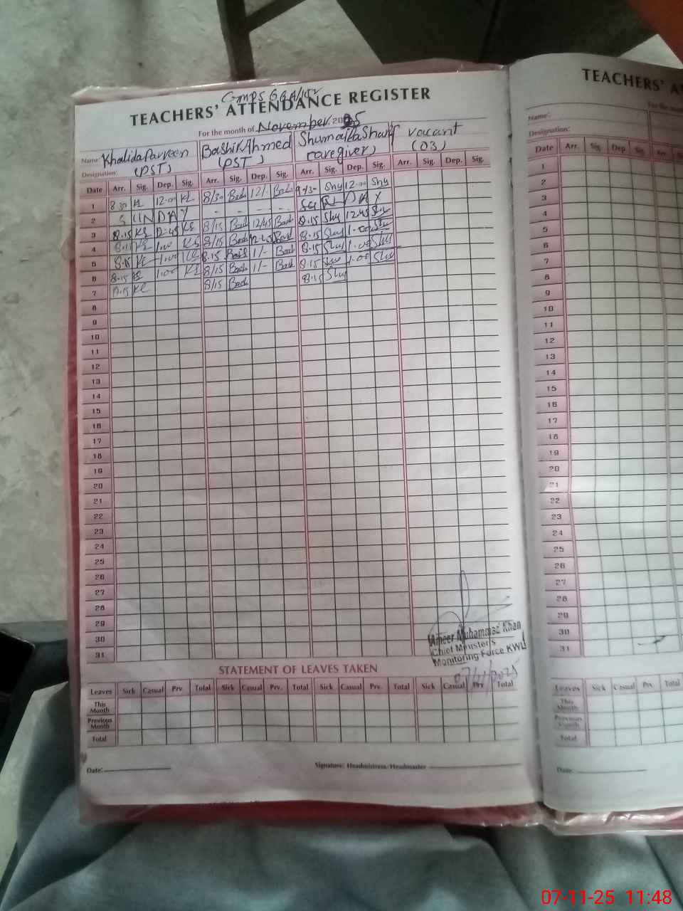 | Name: Kh**** Pa**** Designation: (School Headmaster's/Headmistress's) PST Phone/Cell Number: 03**** |