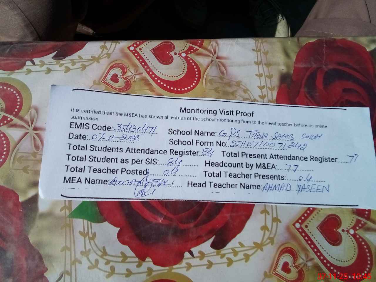 | Attendance Register | Head Teacher | MEA with School | Visit Proof |