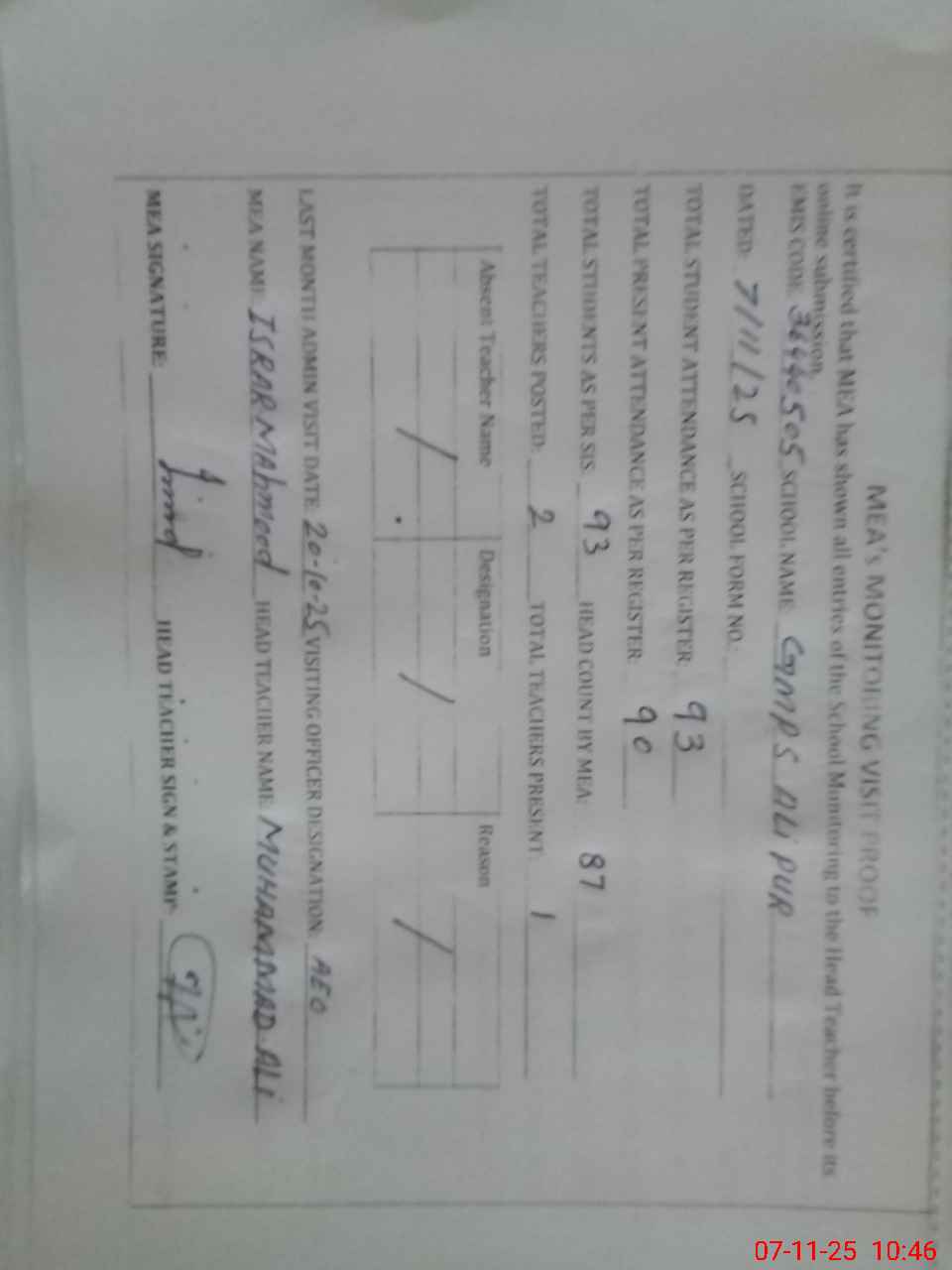 | EMIS Code: 36440505 | Name of School: GMPS ALI PUR | |||