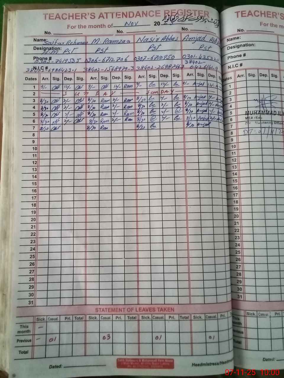 | Name: Sa**** UrRe**** Designation: (School Headmaster's/Headmistress's) PST Phone/Cell Number: 03**** |