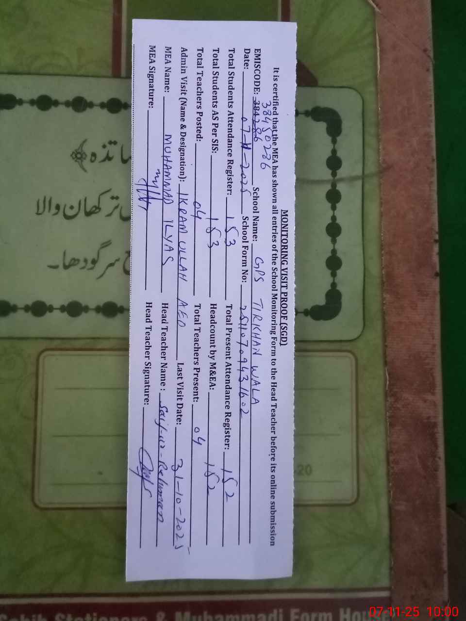 | Attendance Register | Head Teacher | MEA with School | Visit Proof |