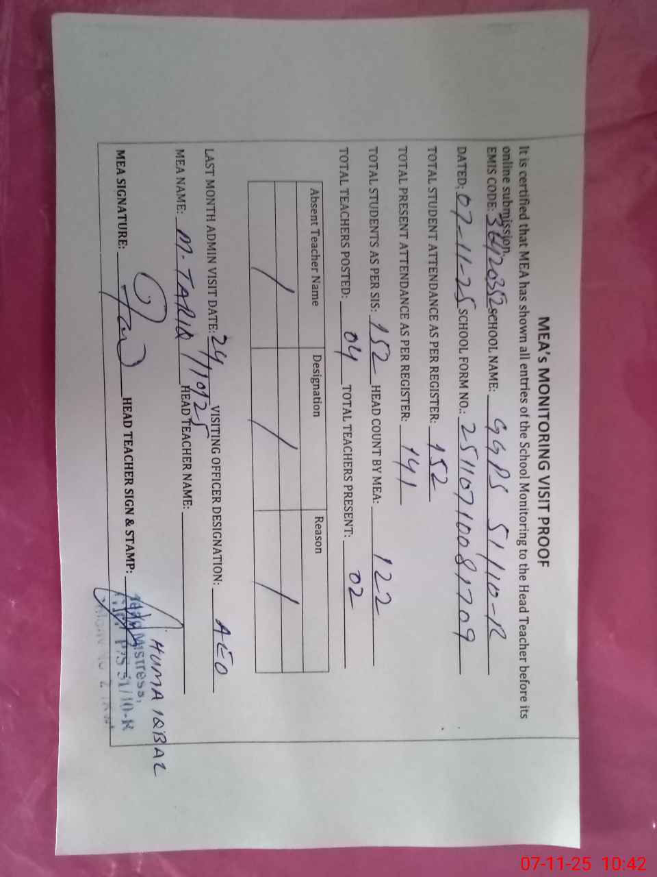 | Attendance Register | Head Teacher | MEA with School | Visit Proof |