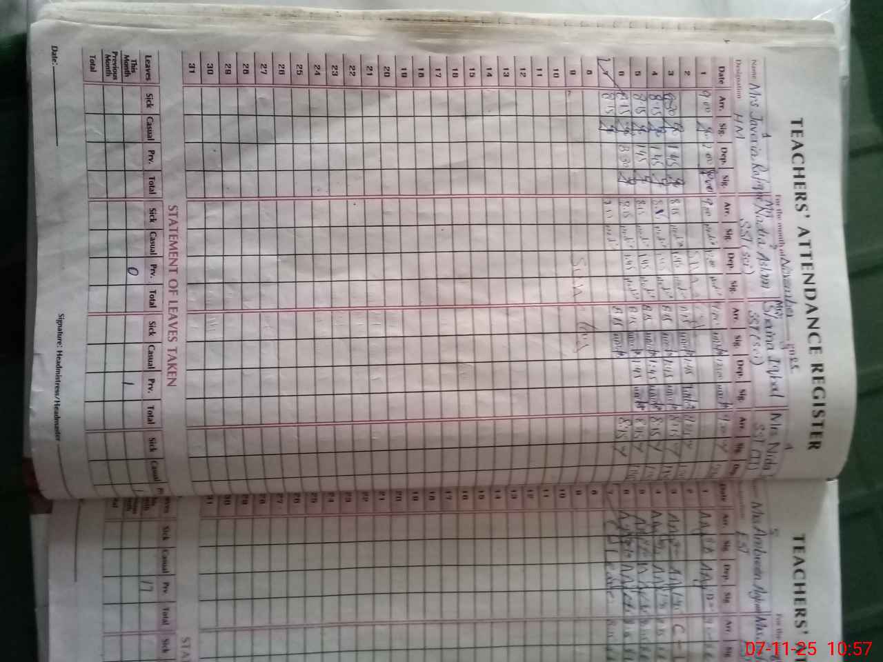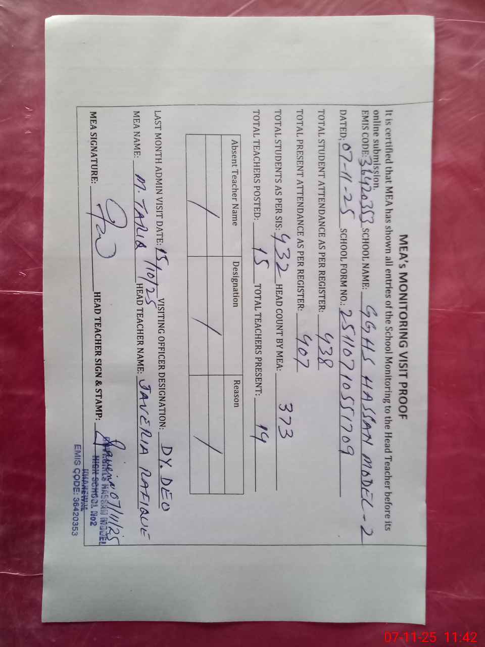 | Attendance Register | Head Teacher | MEA with School | Visit Proof |