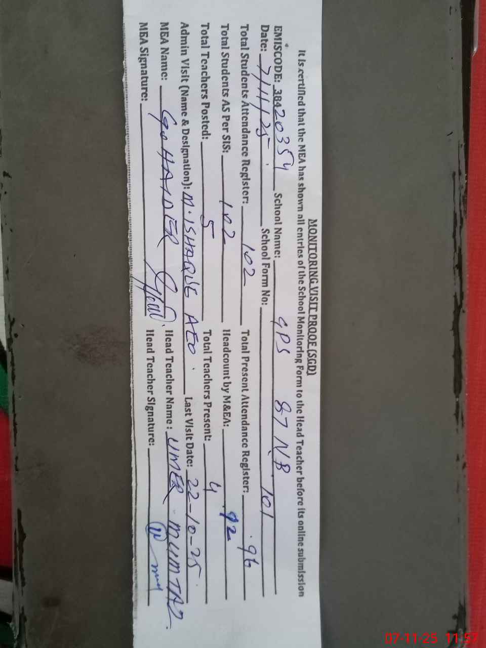 | Attendance Register | Head Teacher | MEA with School | Visit Proof |