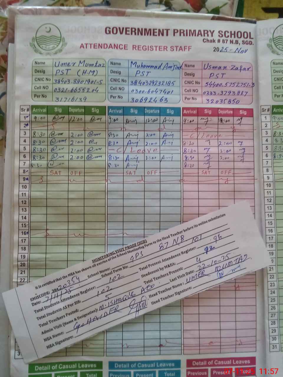 | CNIC | Full Name | Designation | R/C | Absence during last cal. month |