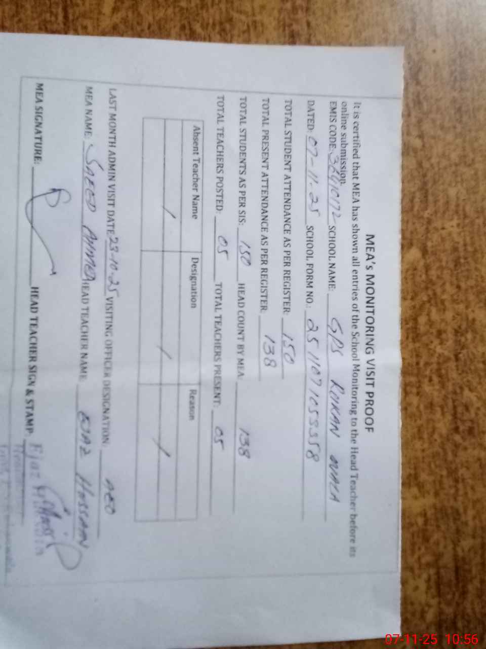 | Monitoring Date: 07-11-2025 | Start Time: 07-11-2025 10:35 AM | End Time: 07-11-2025 11:10 AM | Name of MEA: Sa**** Ah**** | |