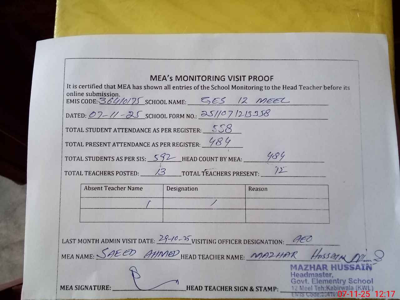 | Attendance Register | Head Teacher | MEA with School | Visit Proof |