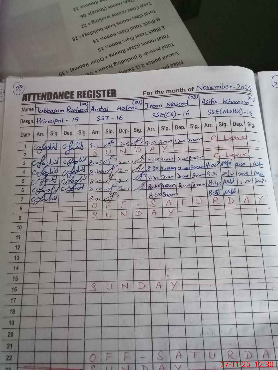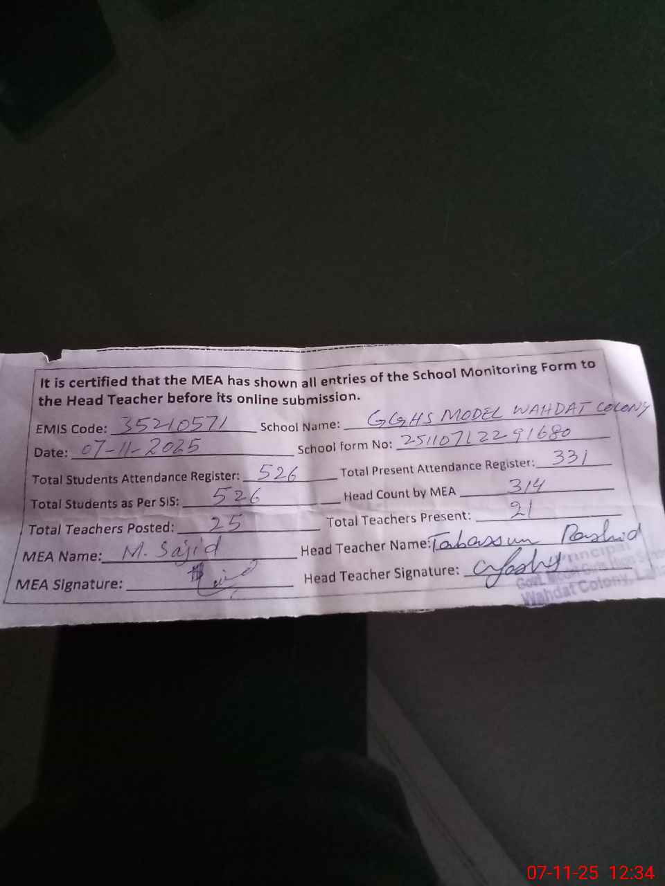 | Remarks (Use Separate Page if Required): School has two buildings and both are functional One sanction of each class 1 to 5 are being taught in second building Present students percentage is 60 A difference of 17 students in Roznamcha and head count DAO SE visited this school on 19 August 2025 Total sanctioned posts of teachers are 34 35210571 | |||||