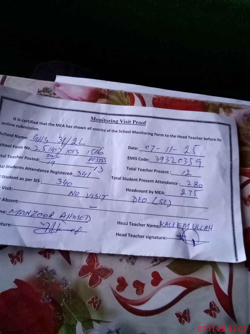 | Certified that this School was Inspected by the Undersigned MEA/DMO Today and the Information Stated Above is as Per Record. | |||||