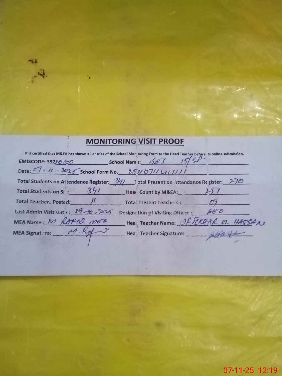 | Attendance Register | Head Teacher | MEA with School | Visit Proof |