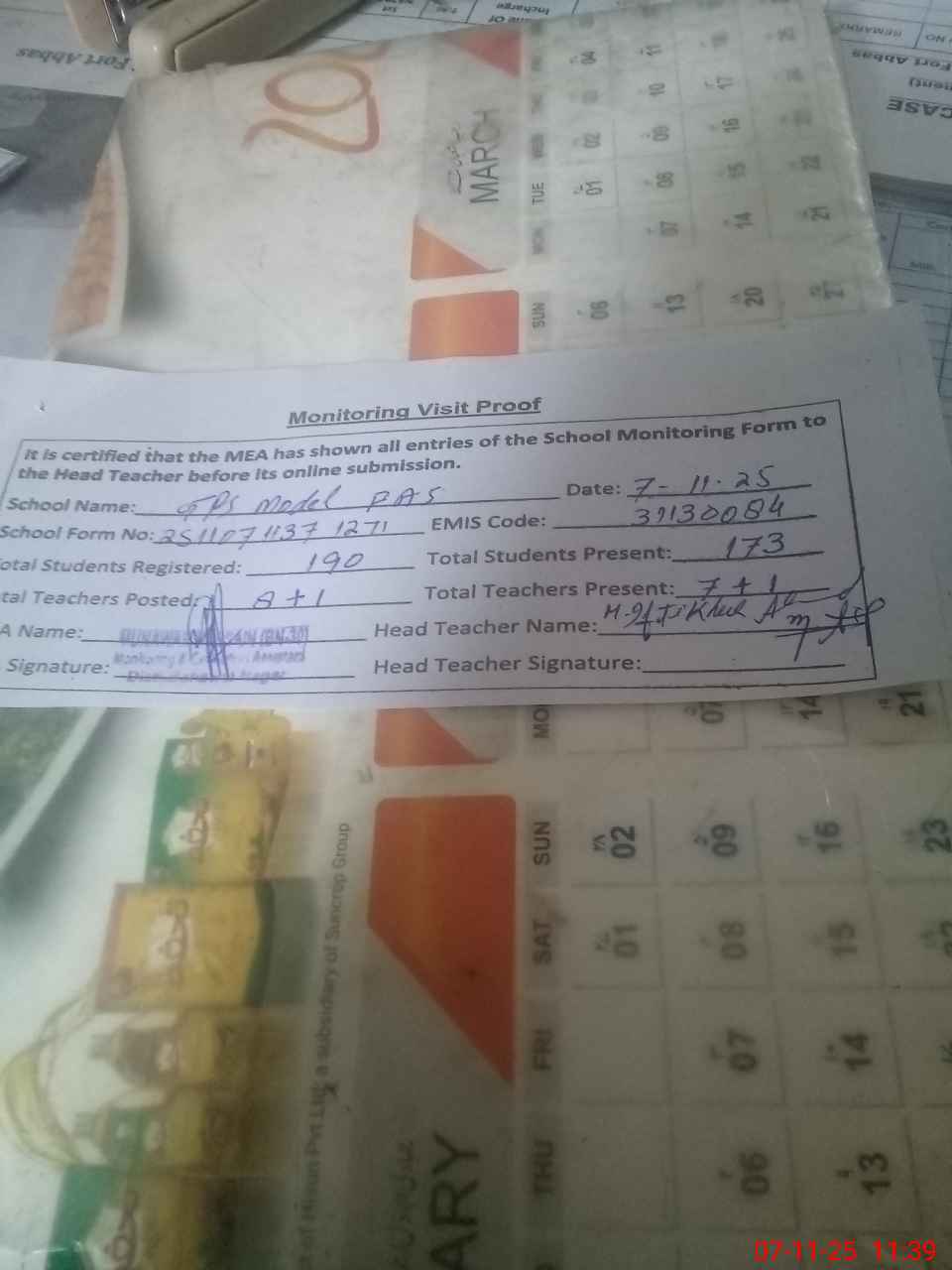 | Attendance Register | Head Teacher | MEA with School | Visit Proof |