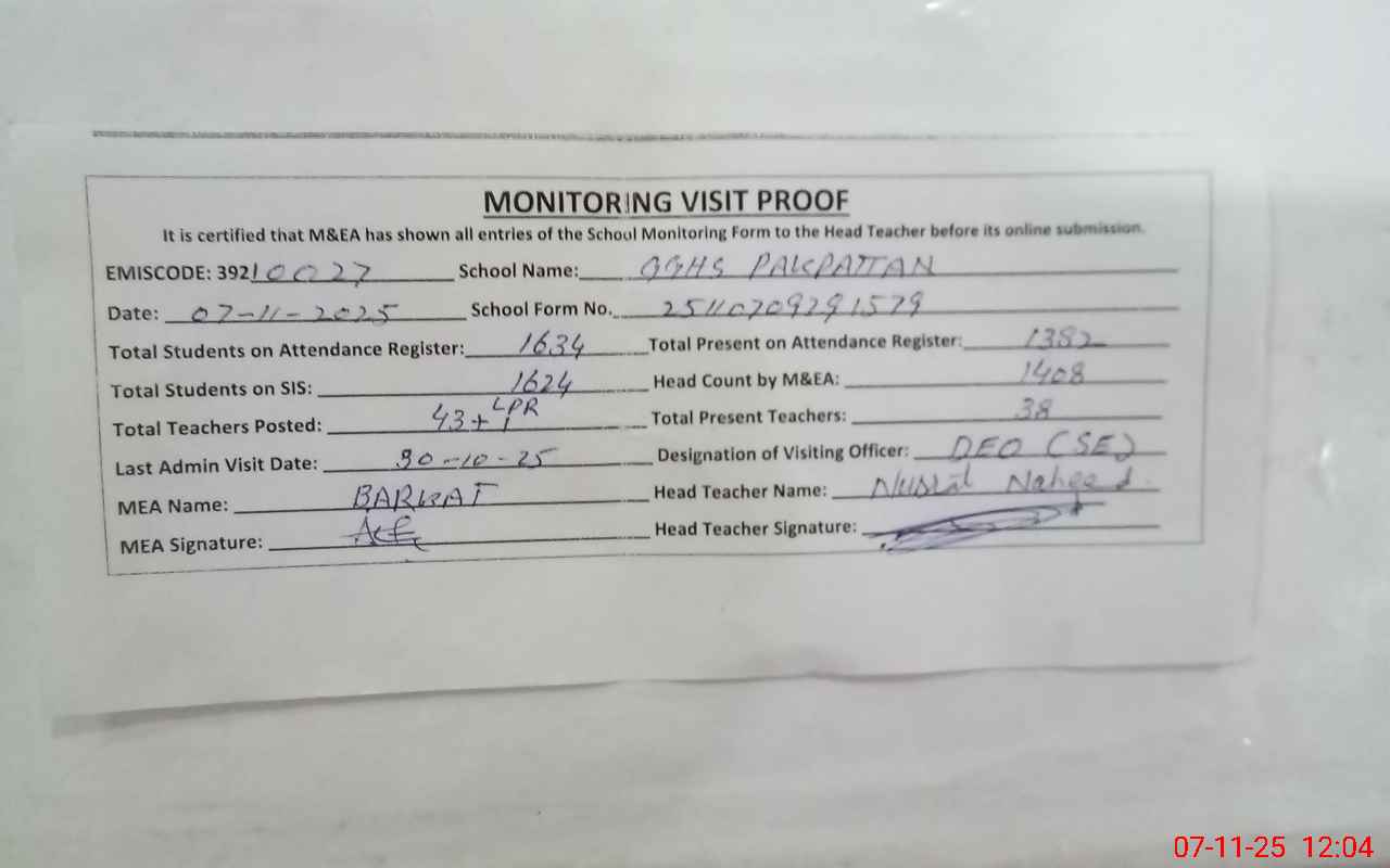 | EMIS Code: 39210027 | Name of School: GGHS PAKPATTAN | |||