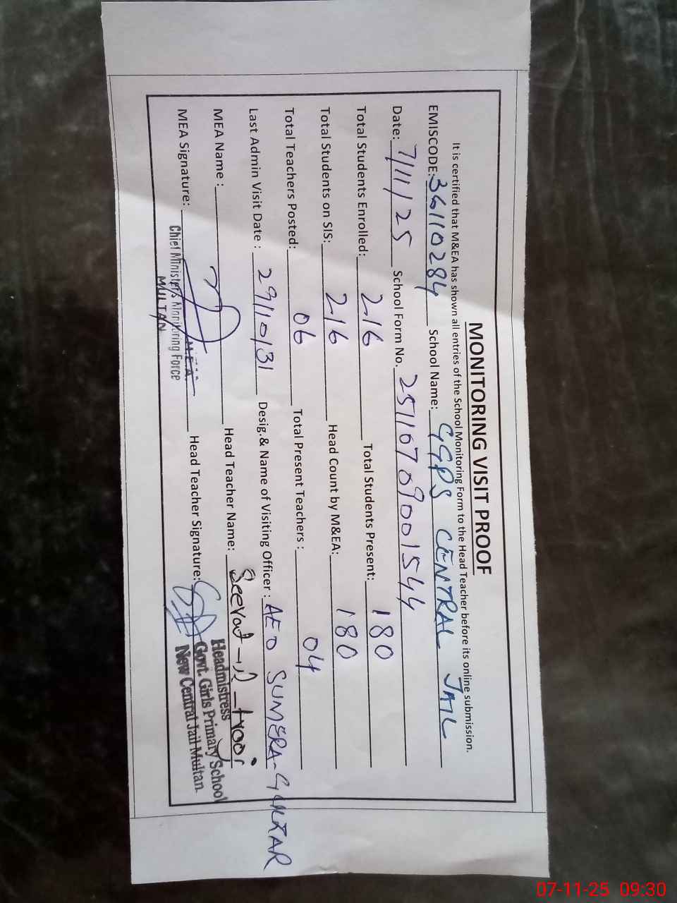 | EMIS Code: 36110284 | Name of School: GGPS NEW CENTRAL JAIL MULTAN | |||