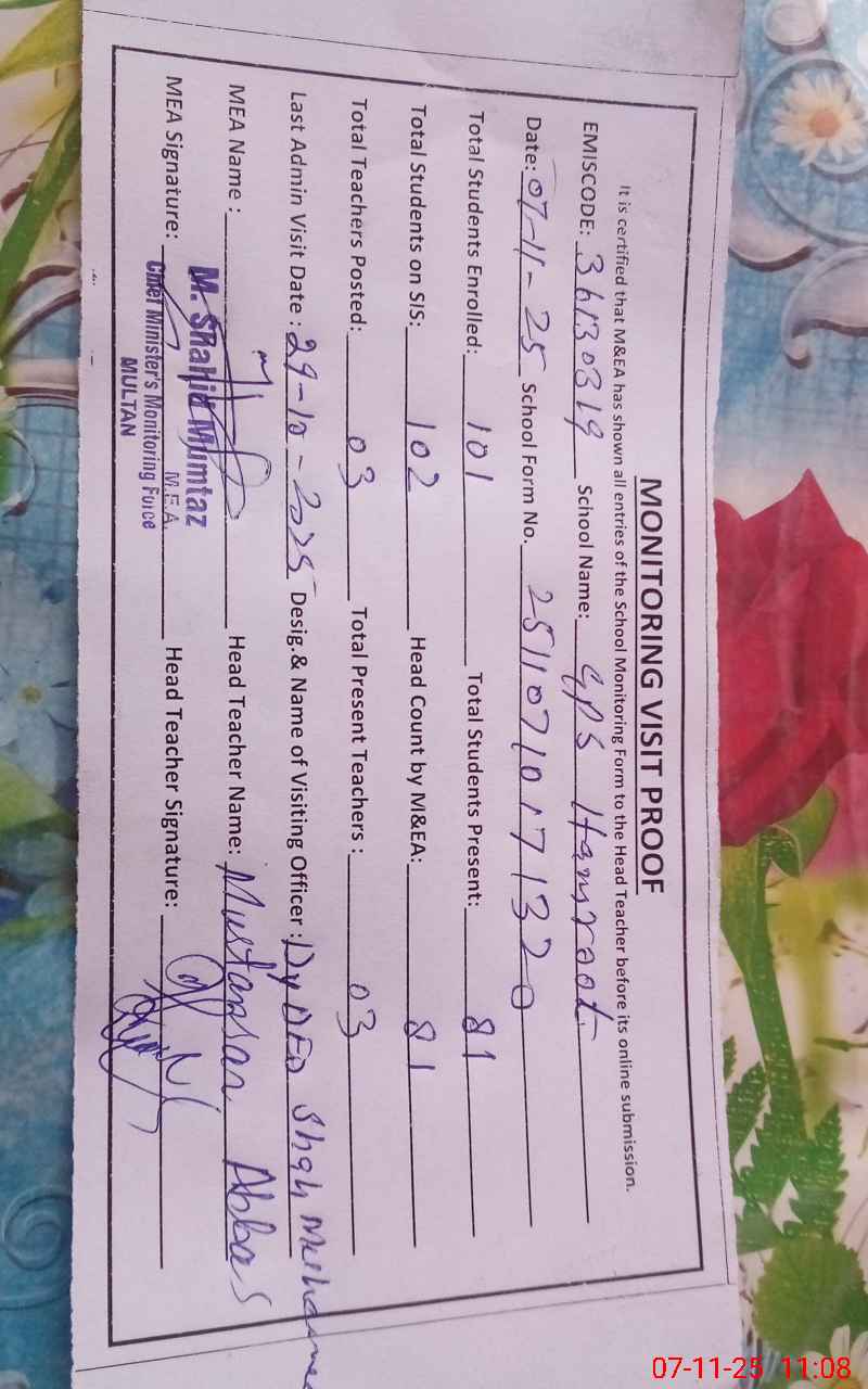 | EMIS Code: 36130319 | Name of School: GPS HAMROOT MULTAN | |||