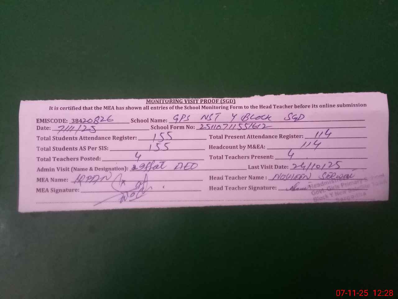 | Name: No**** Sa**** Designation: (School Headmaster's/Headmistress's) PST Phone/Cell Number: 03**** |