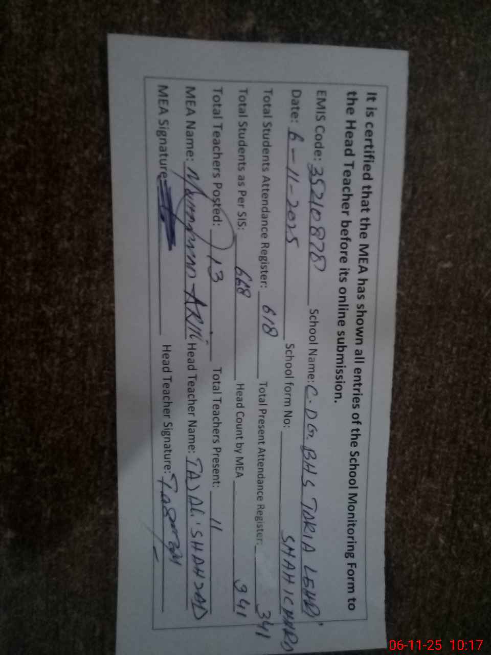 | Certified that this School was Inspected by the Undersigned MEA/DMO Today and the Information Stated Above is as Per Record. | |||||