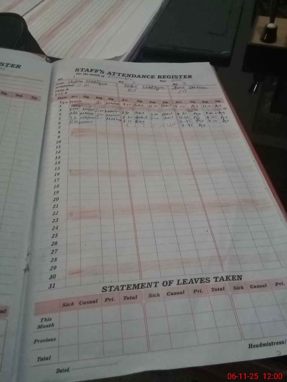 | CNIC | Full Name | Designation | R/C | Absence During Last Calender Month |