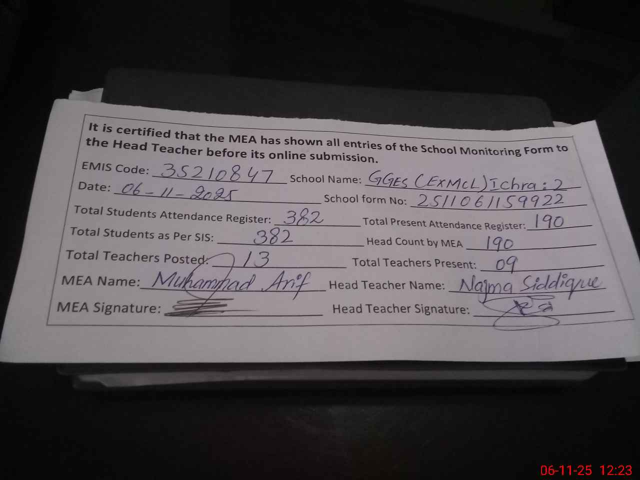 | Attendance Register | Head Teacher | MEA with School | Visit Proof |