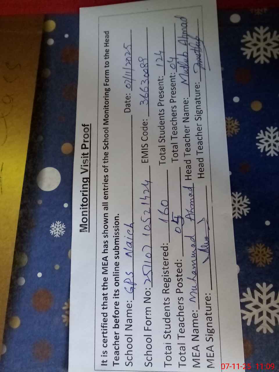 | Attendance Register | Head Teacher | MEA with School | Visit Proof |