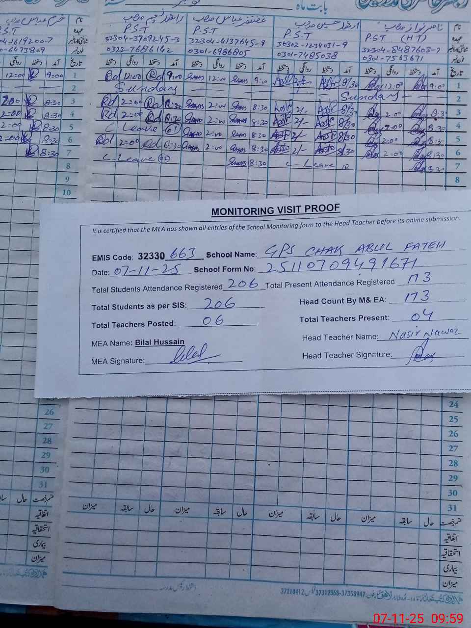 | EMIS Code: 32330663 | Name of School: GPS CHAK ABUL FATEH | |||