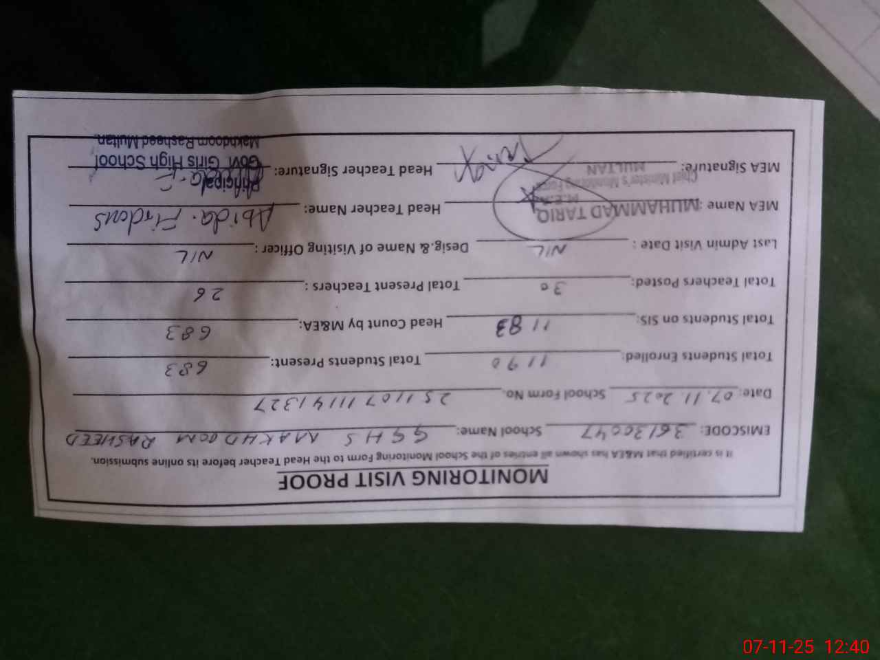 | Certified that this School was Inspected by the Undersigned MEA/DMO Today and the Information Stated Above is as Per Record. | |||||