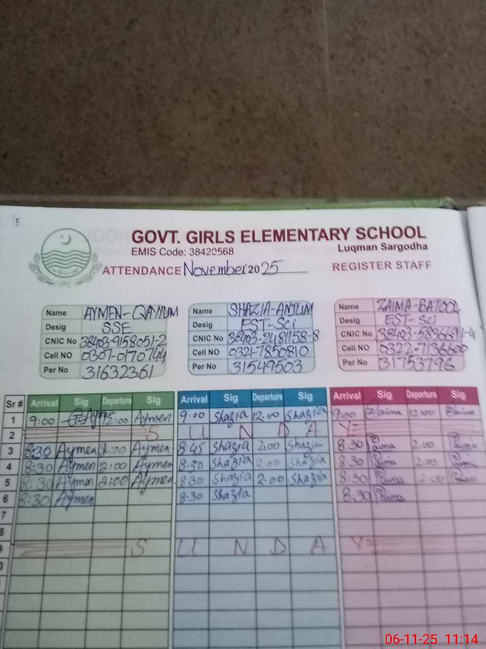 | CNIC | Full Name | Designation | R/C | Absence during last cal. month |