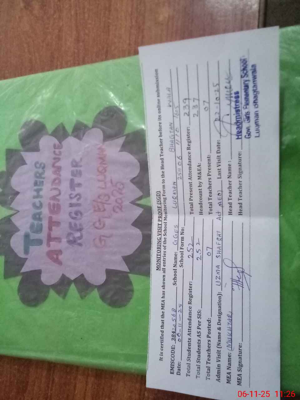 | Attendance Register | Head Teacher | MEA with School | Visit Proof |