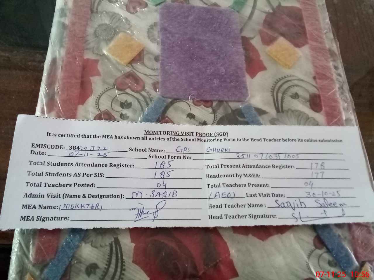 | Attendance Register | Head Teacher | MEA with School | Visit Proof |