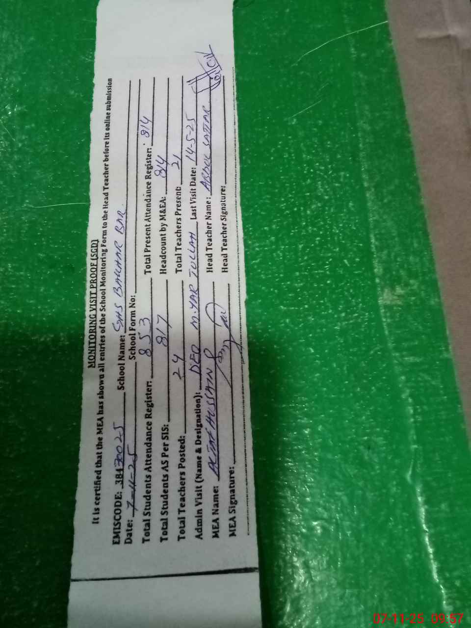 | Attendance Register | Head Teacher | MEA with School | Visit Proof |