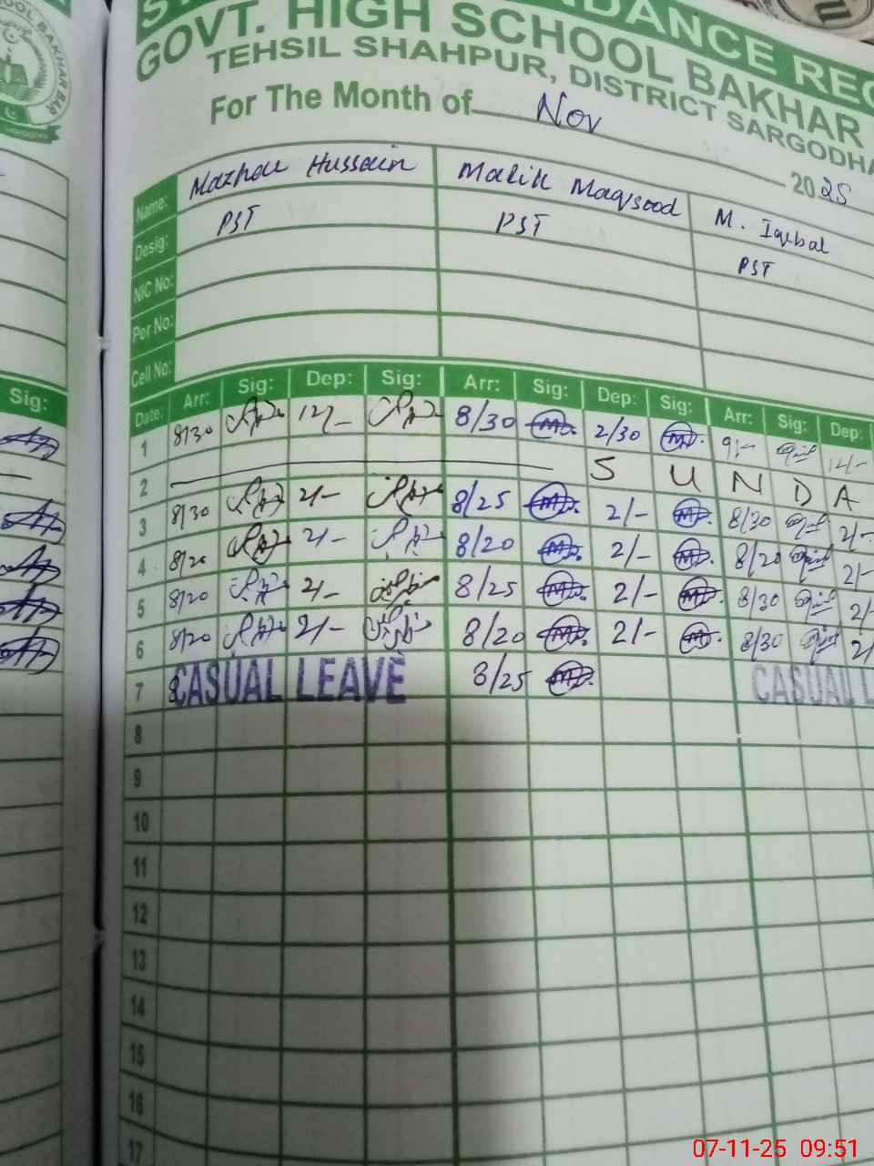 | CNIC | Full Name | Designation | R/C | Absence During Last Calender Month |