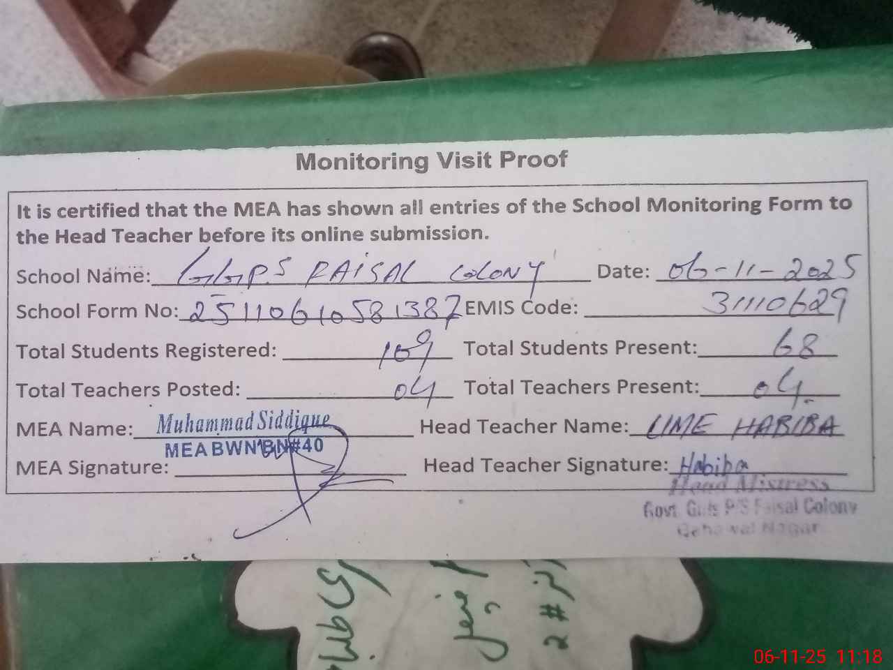 | EMIS Code: 31110629 | Name of School: GGPS FAISAL COLONY | |||