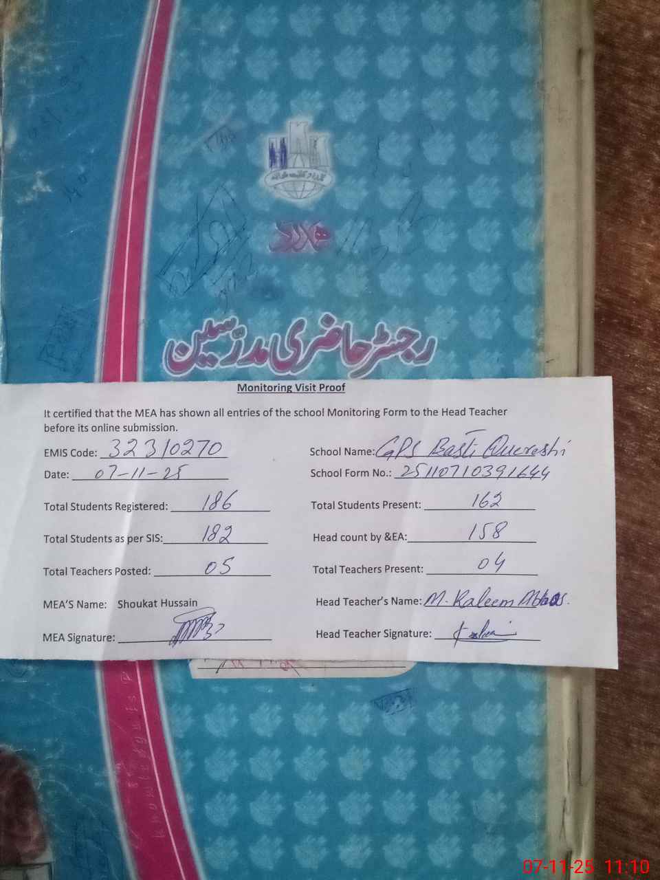 | Attendance Register | Head Teacher | MEA with School | Visit Proof |