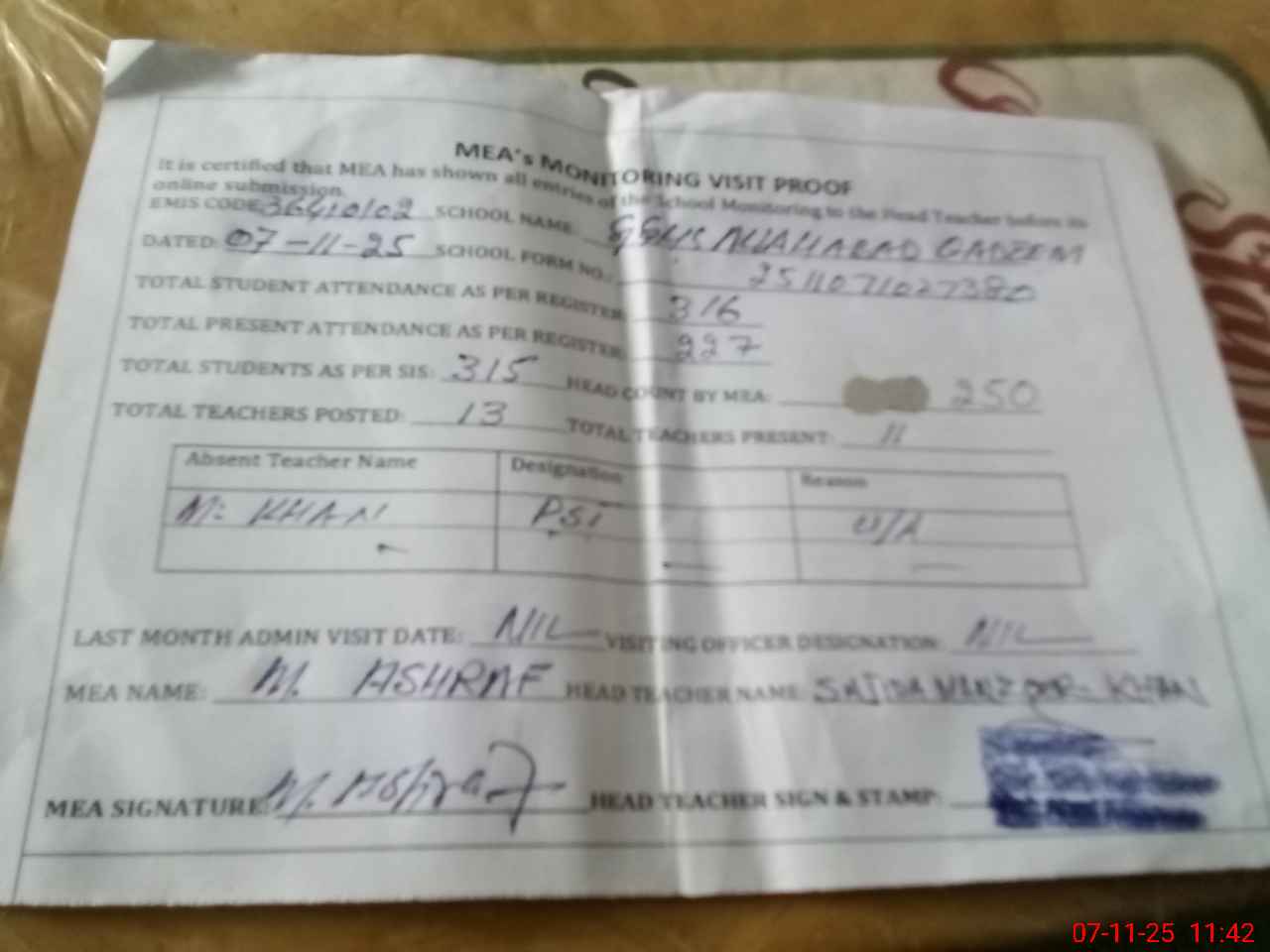 | Attendance Register | Head Teacher | MEA with School | Visit Proof |