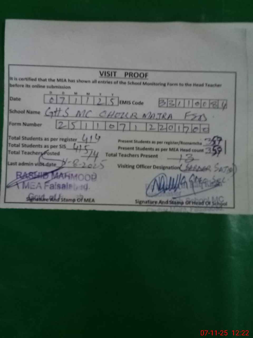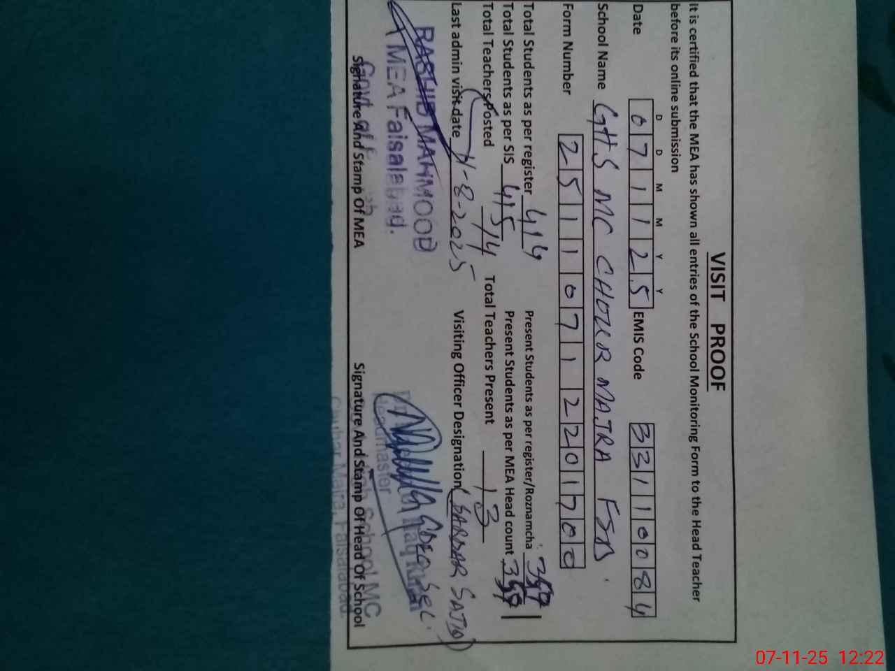 | Certified that this School was Inspected by the Undersigned MEA/DMO Today and the Information Stated Above is as Per Record. | |||||