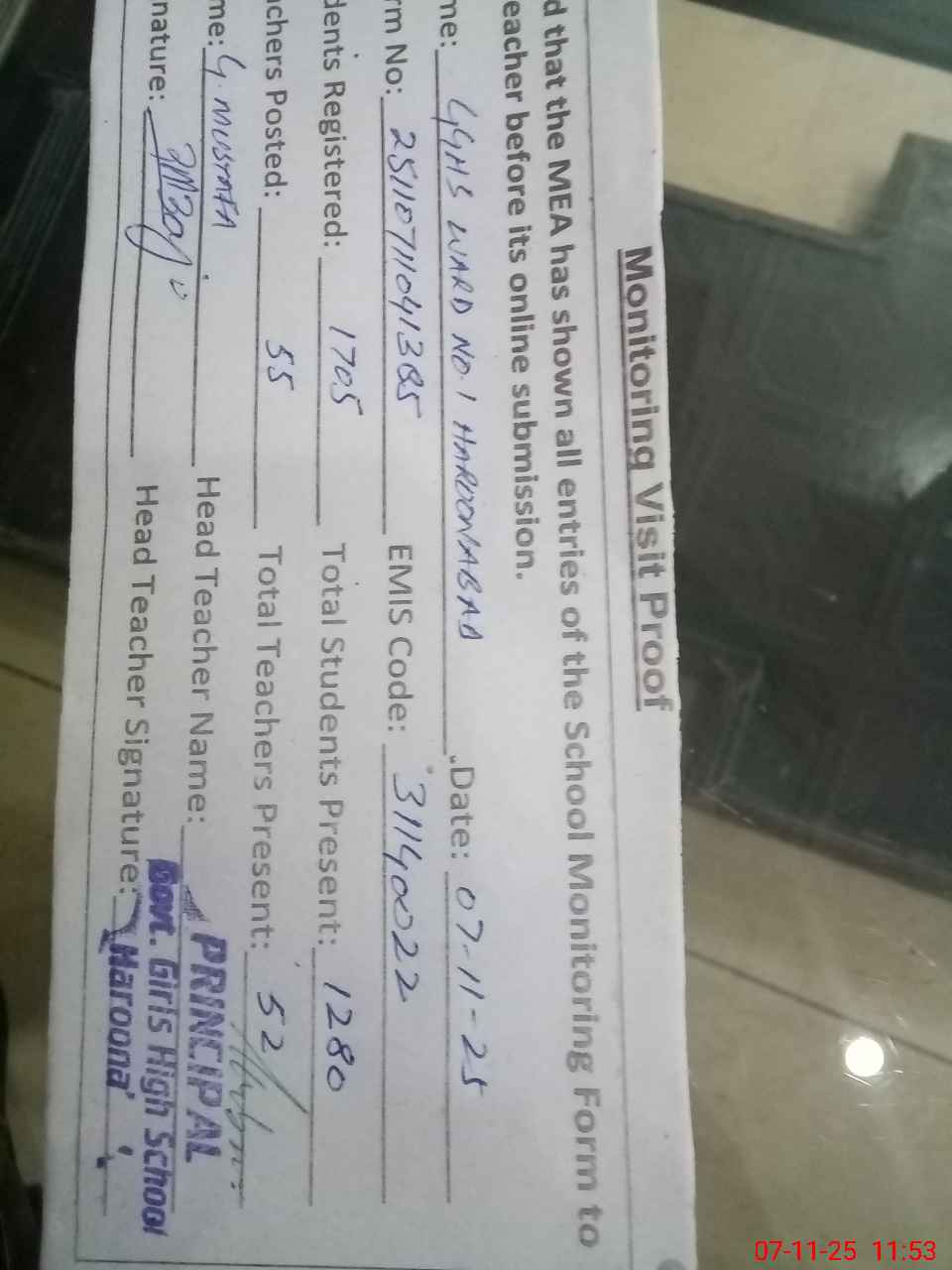| Attendance Register | Head Teacher | MEA with School | Visit Proof |