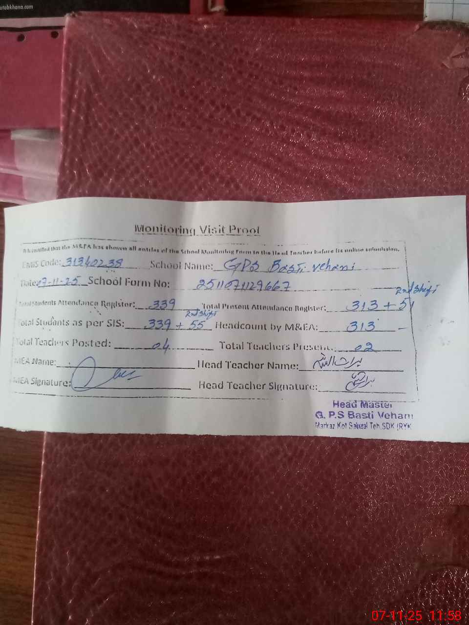 | Attendance Register | Head Teacher | MEA with School | Visit Proof |