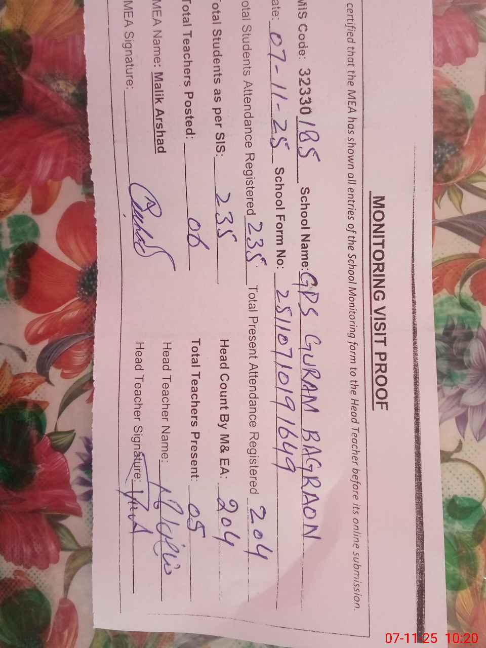 | Attendance Register | Head Teacher | MEA with School | Visit Proof |