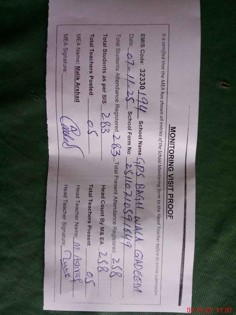 | Attendance Register | Head Teacher | MEA with School | Visit Proof |