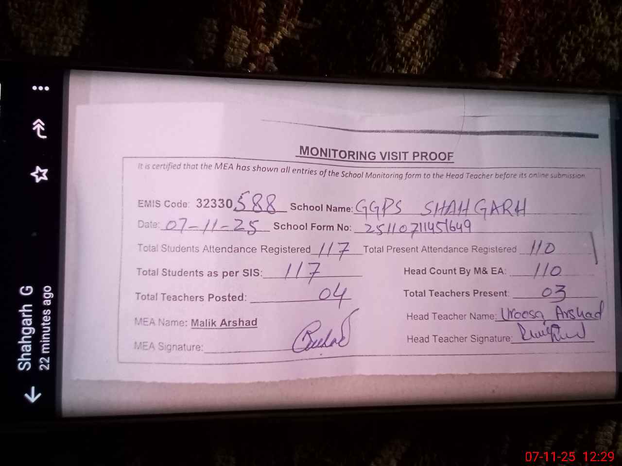 | Attendance Register | Head Teacher | MEA with School | Visit Proof |