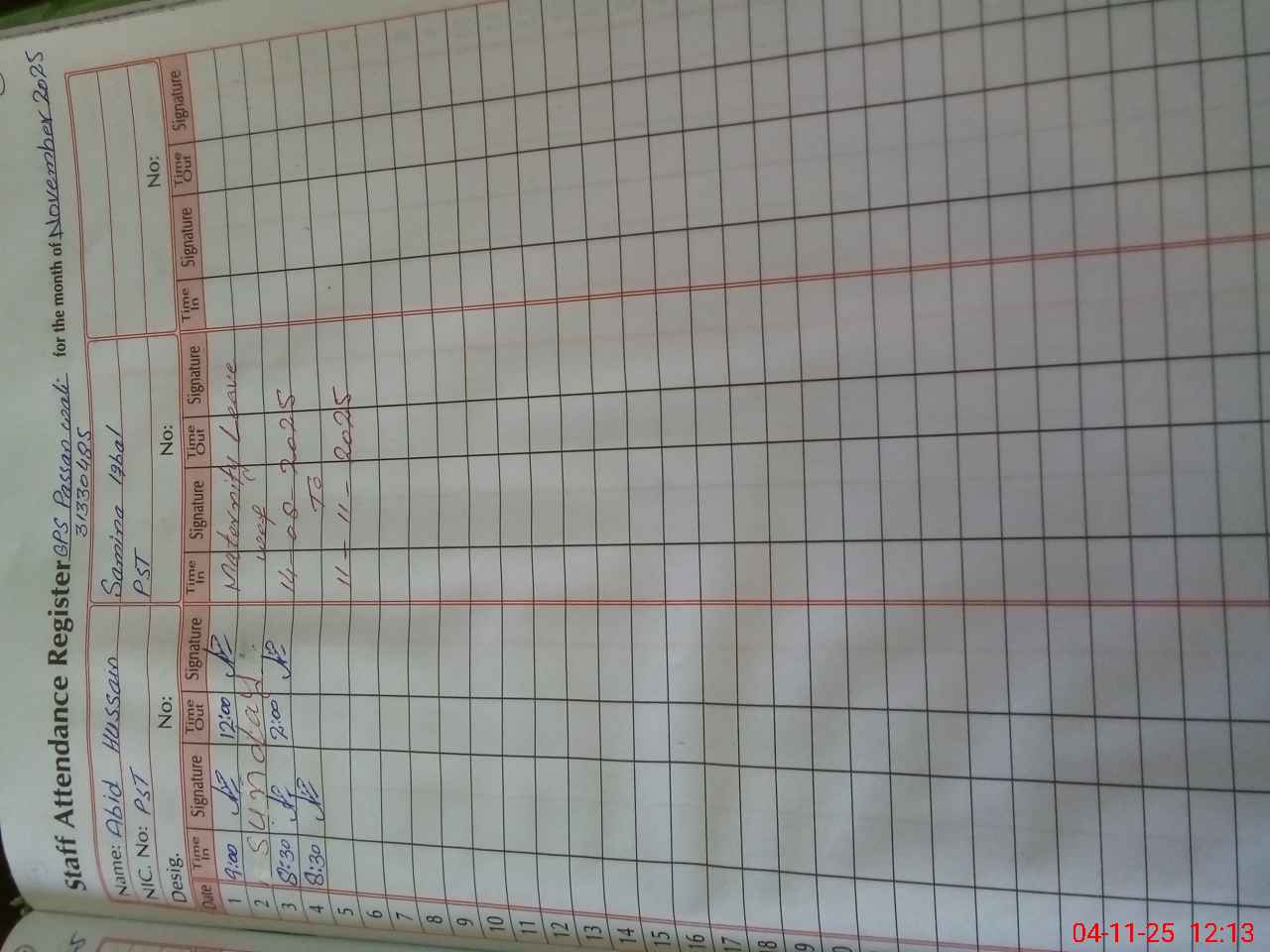 | CNIC | Full Name | Designation | R/C | Absence During Last Calender Month |