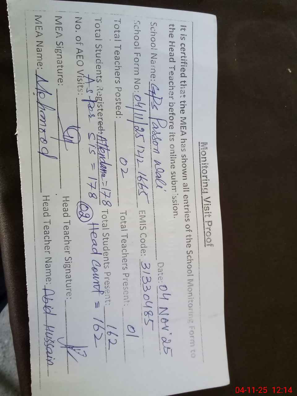 | Attendance Register | Head Teacher | MEA with School | Visit Proof |