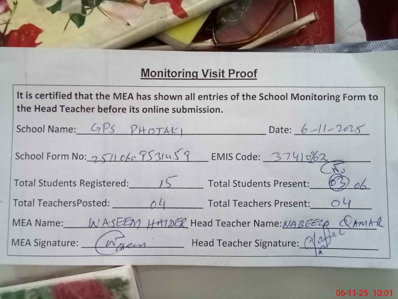 | Attendance Register | Head Teacher | MEA with School | Visit Proof |