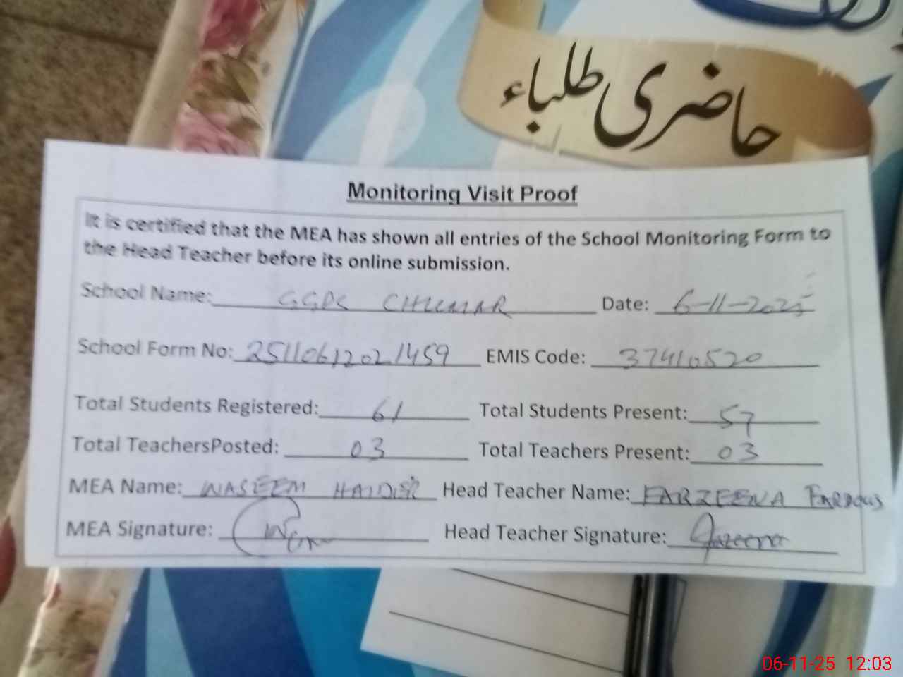 | Attendance Register | Head Teacher | MEA with School | Visit Proof |