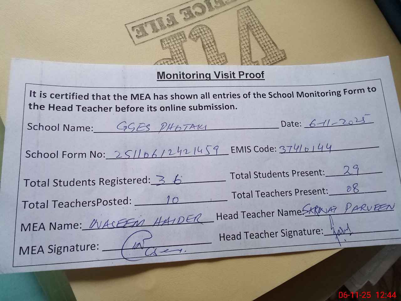| Attendance Register | Head Teacher | MEA with School | Visit Proof |