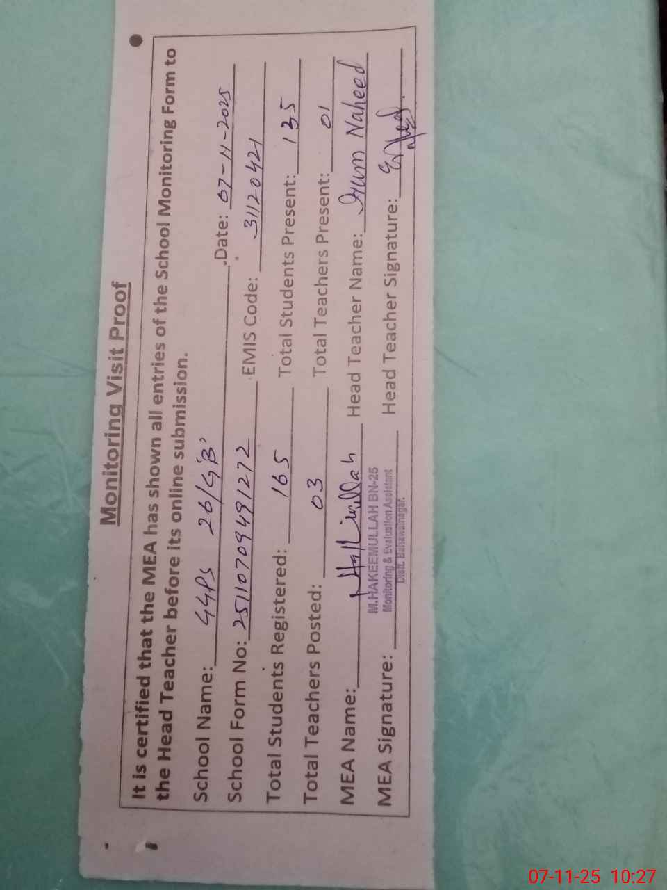 | Attendance Register | Head Teacher | MEA with School | Visit Proof |