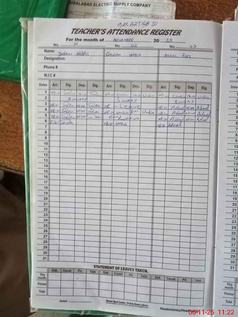 | CNIC | Full Name | Designation | R/C | Absence During Last Calender Month |
