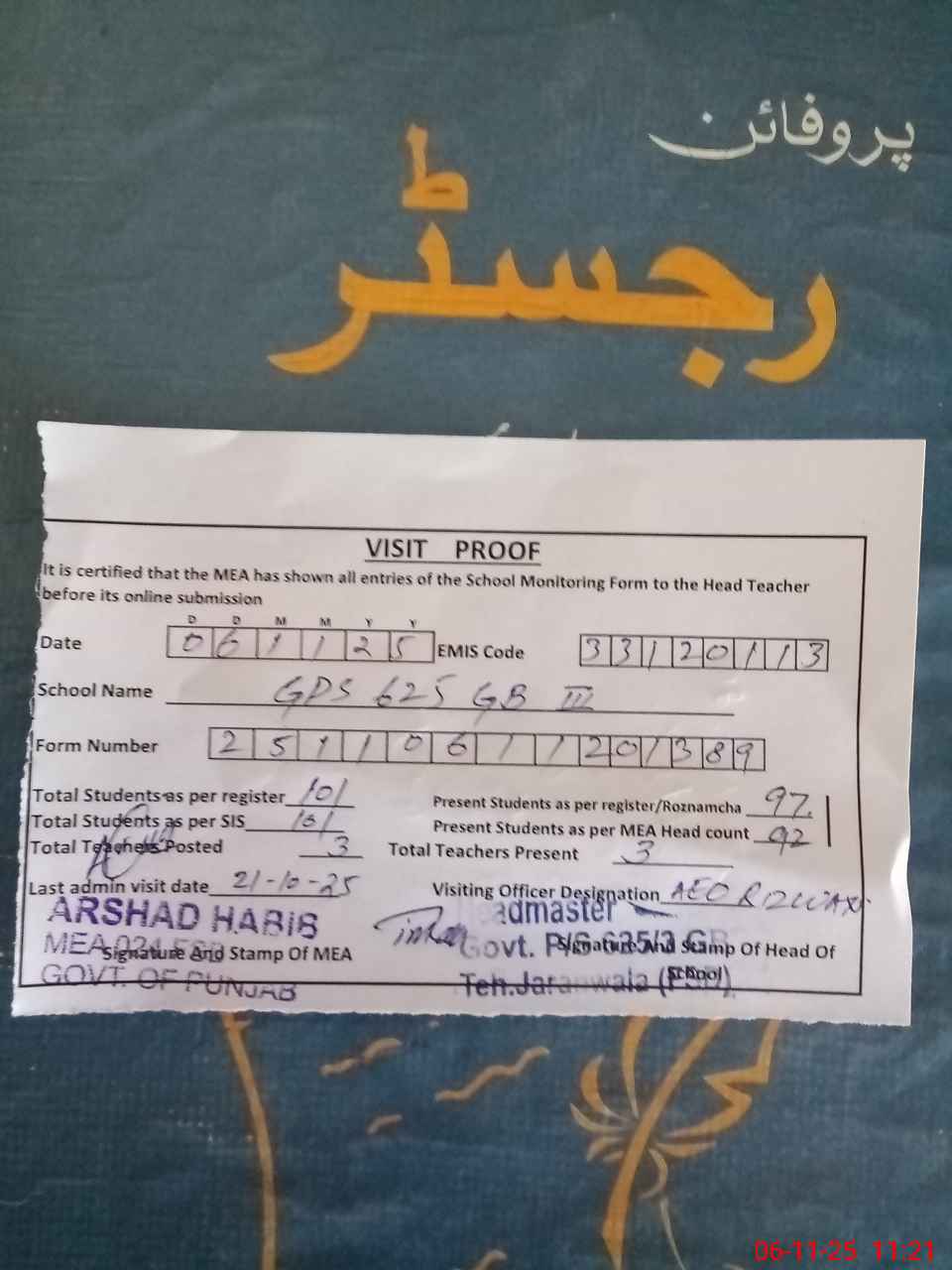 | Attendance Register | Head Teacher | MEA with School | Visit Proof |
