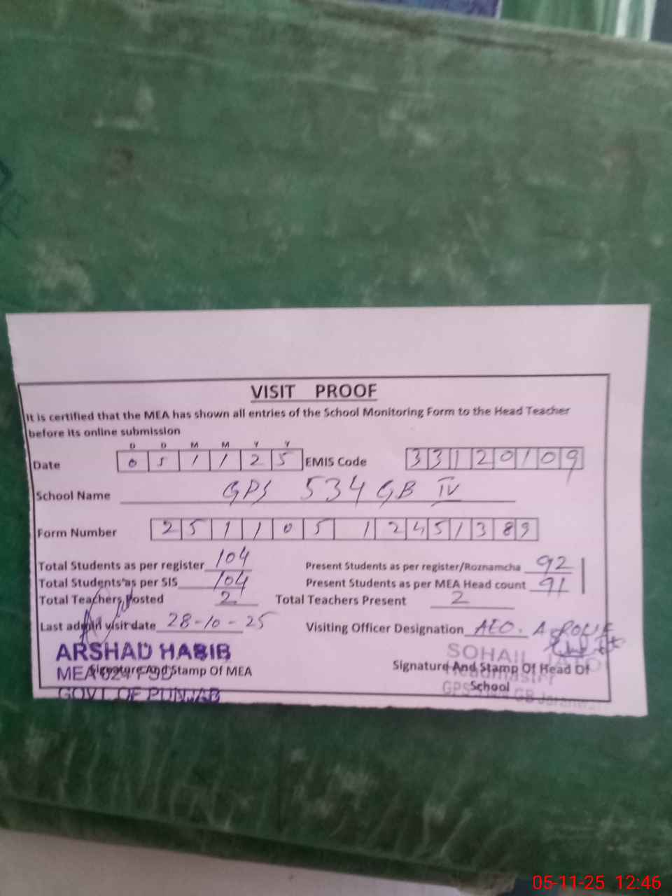 | Attendance Register | Head Teacher | MEA with School | Visit Proof |